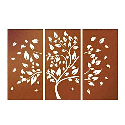 Each panel in the set features an intricate design of cascading leaves, expertly laser-cut into the Corten steel. The detailed patterns evoke a sense of movement and tranquility, reminiscent of a gentle autumn breeze that carries leaves in a graceful descent.