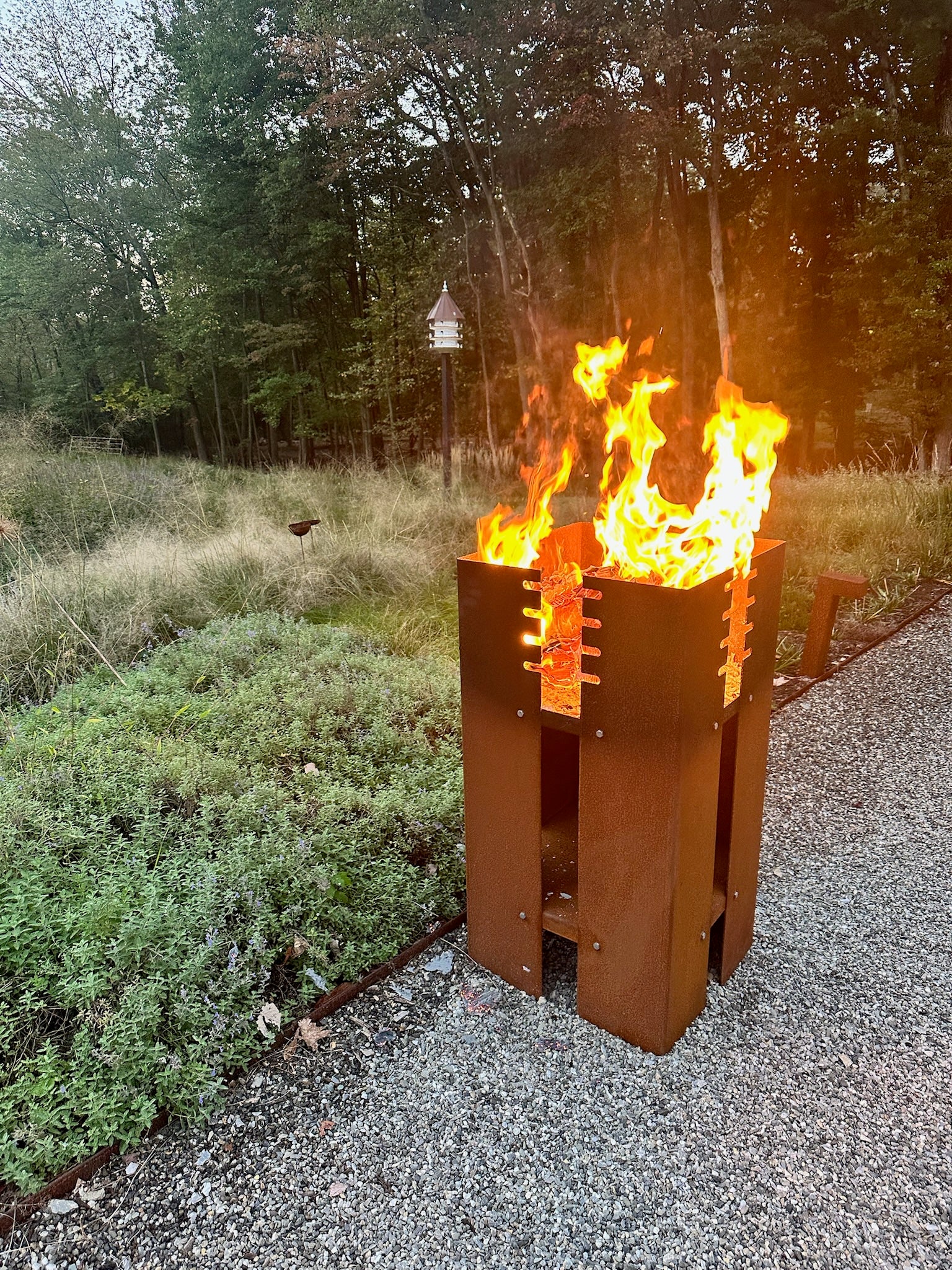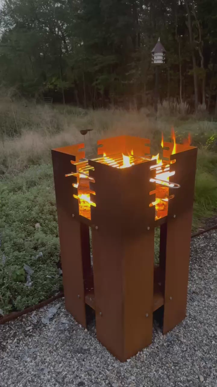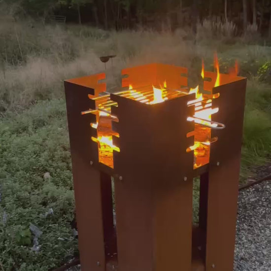 Elevate your outdoor cooking and entertaining with the Firepit Column with Grill Option, expertly crafted from durable Corten steel. Combining the beauty of modern design with the practicality of a built-in grill, this versatile firepit serves as a striking centerpiece and a functional cooking station for your outdoor gatherings.