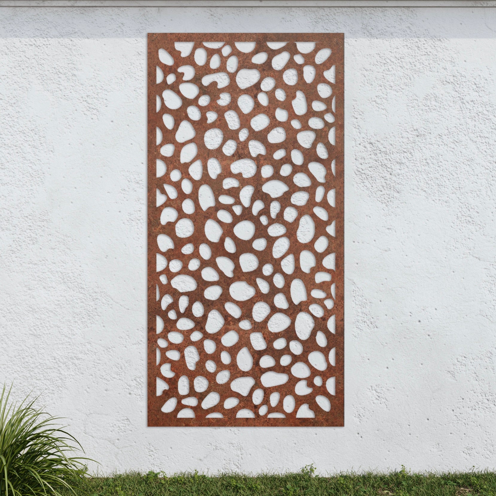 The panel features a series of rounded, pebble-like designs, each meticulously shaped and arranged to evoke a natural, fluid pattern. The varying shapes and subtle color shifts within the Corten steel's surface enhance the panel's tactile and visual appeal, capturing light in intriguing ways. The rust-colored patina adds depth and warmth, making the panel a captivating focal point in any outdoor or modern design setting.