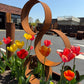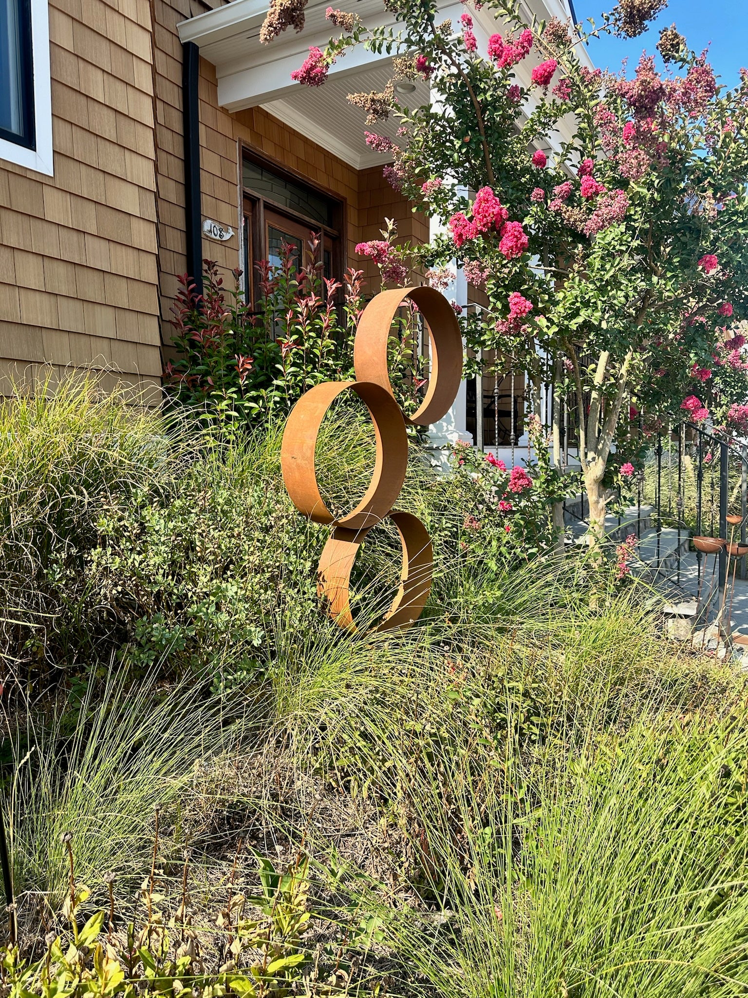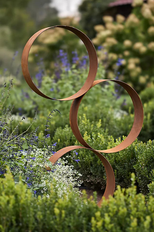 The dynamic interplay of the rings creates a sense of movement and fluidity, inviting viewers to appreciate the piece from multiple angles. The geometric simplicity of the design is juxtaposed with the organic, rusted surface, resulting in a harmonious balance between industrial and natural elements. Ideal for contemporary gardens, urban spaces, or art collections, the Ring Trio Sculpture serves as a captivating focal point, embodying both artistic sophistication and rugged resilience.