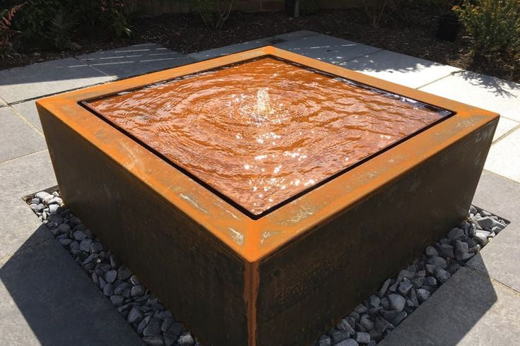 Water cascades gracefully down the steel face, creating a mesmerizing visual and auditory experience. The rusted texture of the steel contrasts beautifully with the smooth, flowing water, while the natural weathering of the corten steel adds depth and character to the piece. The square shape of the waterfall provides a modern, architectural feel, making it a compelling focal point for contemporary landscapes, urban settings, or sophisticated garden spaces.