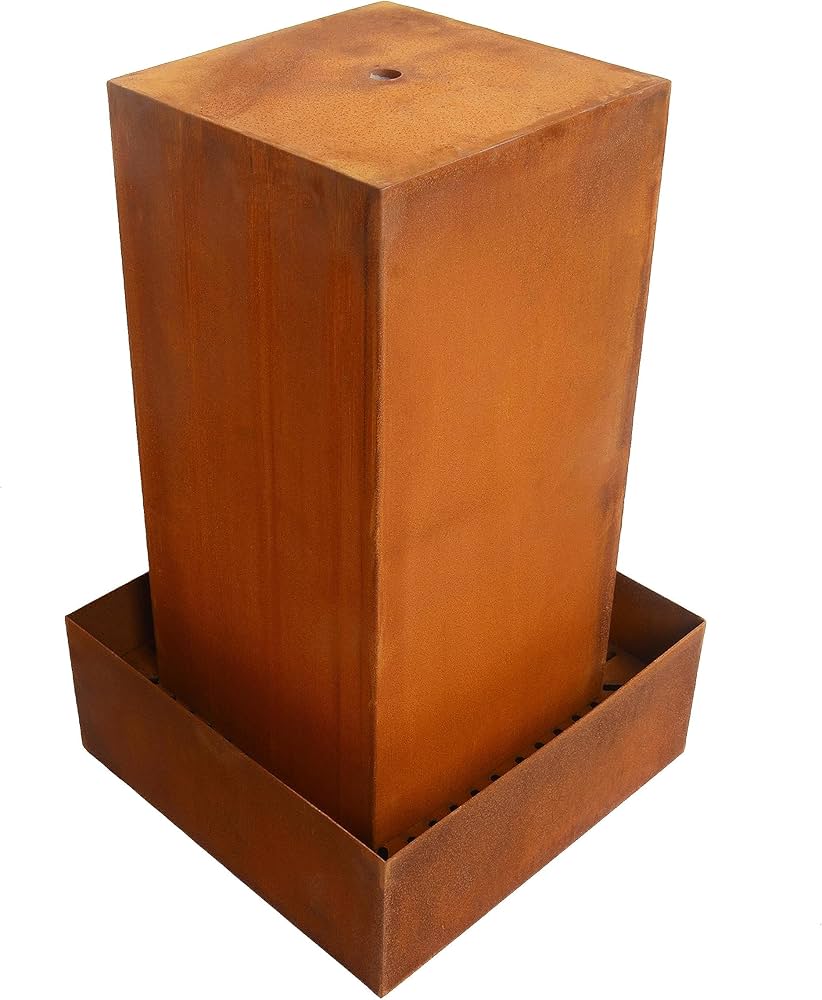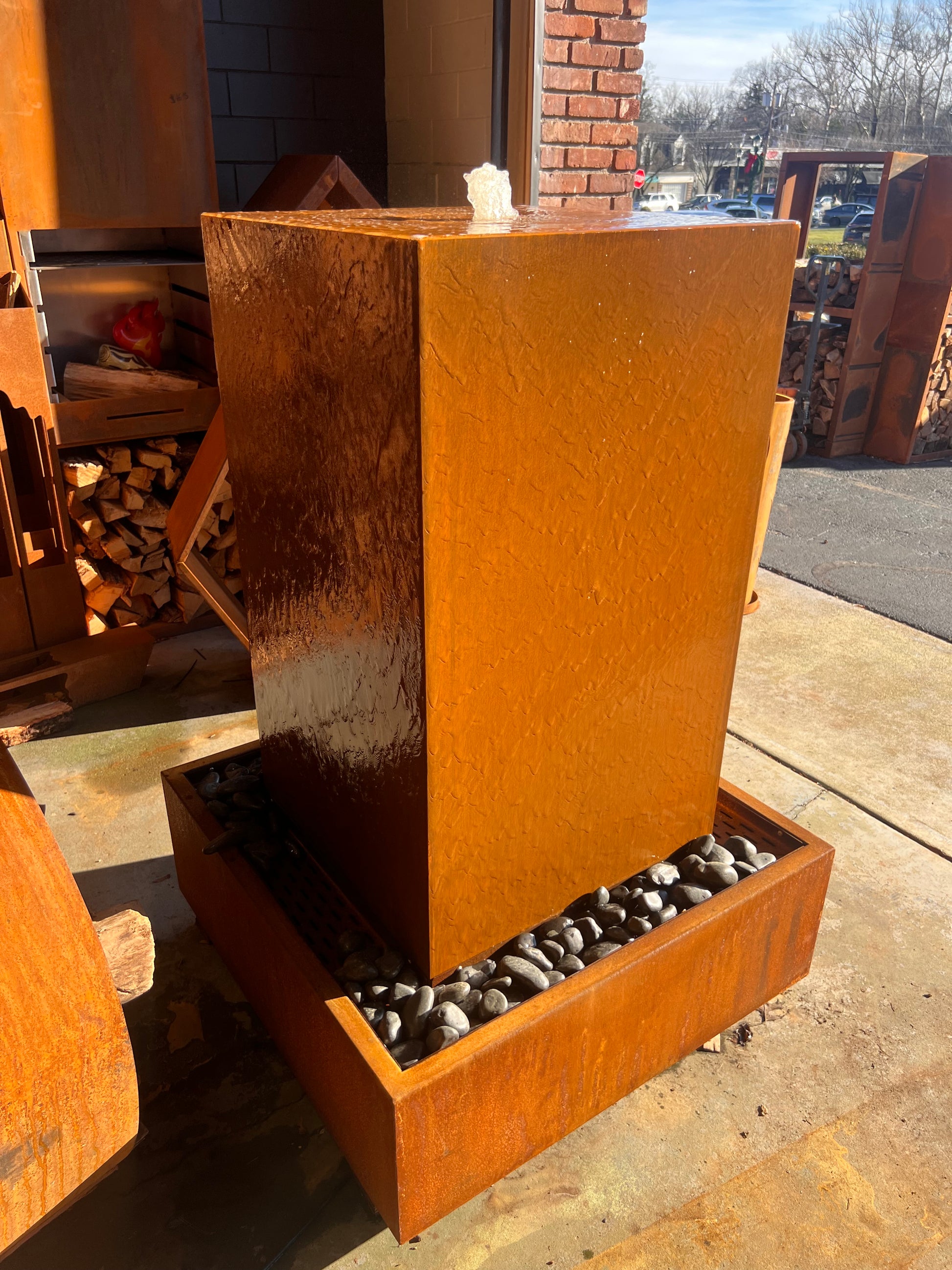 The design highlights a sleek, elongated form, where water flows effortlessly down the steel surface, creating a striking contrast with the rusted, earthy tones of the steel. The natural patina of the corten steel not only adds a layer of visual complexity but also ensures durability, allowing the piece to weather the elements gracefully over time.