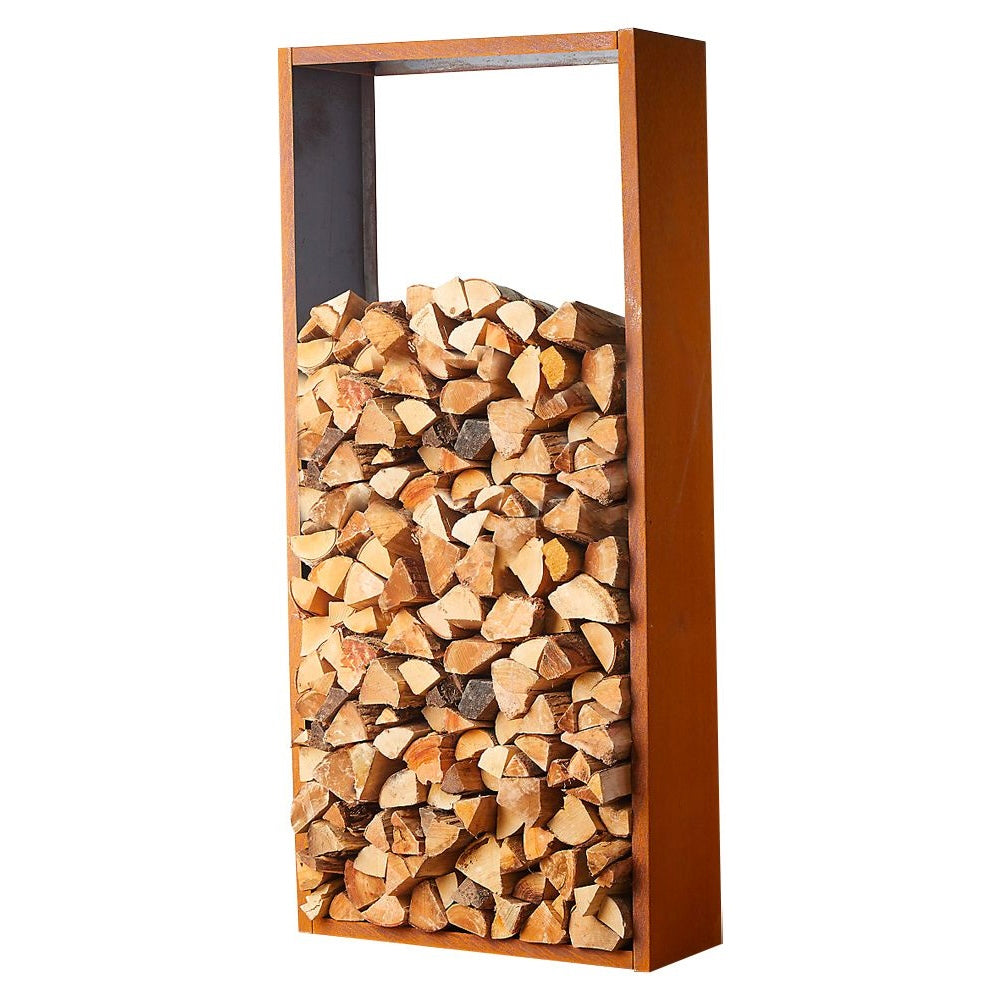 The incorporation of wood shelves adds warmth and organic texture, creating a visually appealing contrast against the industrial chic of corten steel. Whether used in a living room, garden, or patio, this storage wall provides ample space to neatly store firewood, gardening tools, or decorative items, keeping them organized and easily accessible.